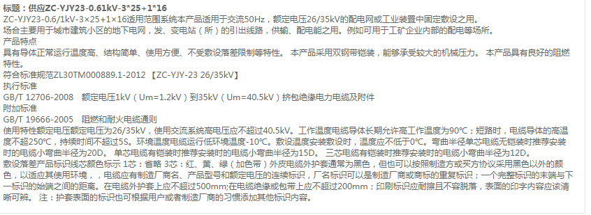 yjy23是铜芯交联聚乙烯绝缘聚乙烯护套钢带铠装聚乙烯外护套电力电缆。